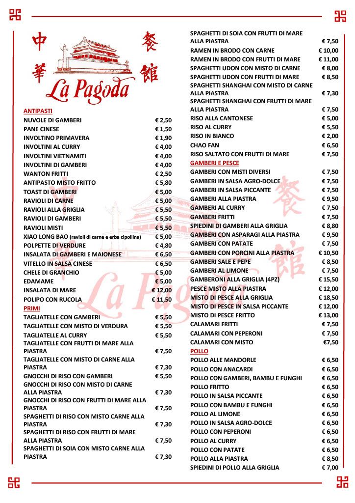 Se vuoi assaporare le autentiche specialità della cucina cinese e orientale in genere, La Pagoda ti offre un menù vario, ricco di pietanze a base di carne, pesce e verdure, per ogni gusto. Siamo specializzati nella cottura tradizionale di pollo, vitello, maiale e anatra, con un'ampia varietà di accompagnamenti, dai condimenti in agrodolce, al curry e con frutta e verdura.